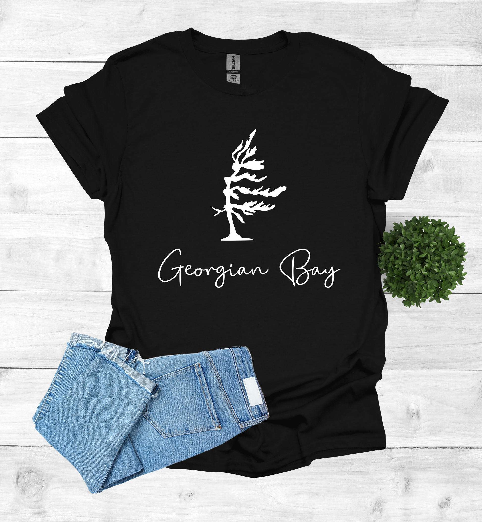 Designs are printed and applied to the shirt by us right here in Georgian Bay.