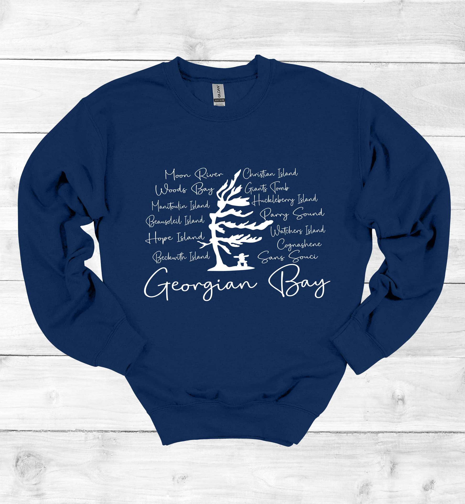 Georgian Bay Wind Swept Pine Tree with Island names Sweatshirt