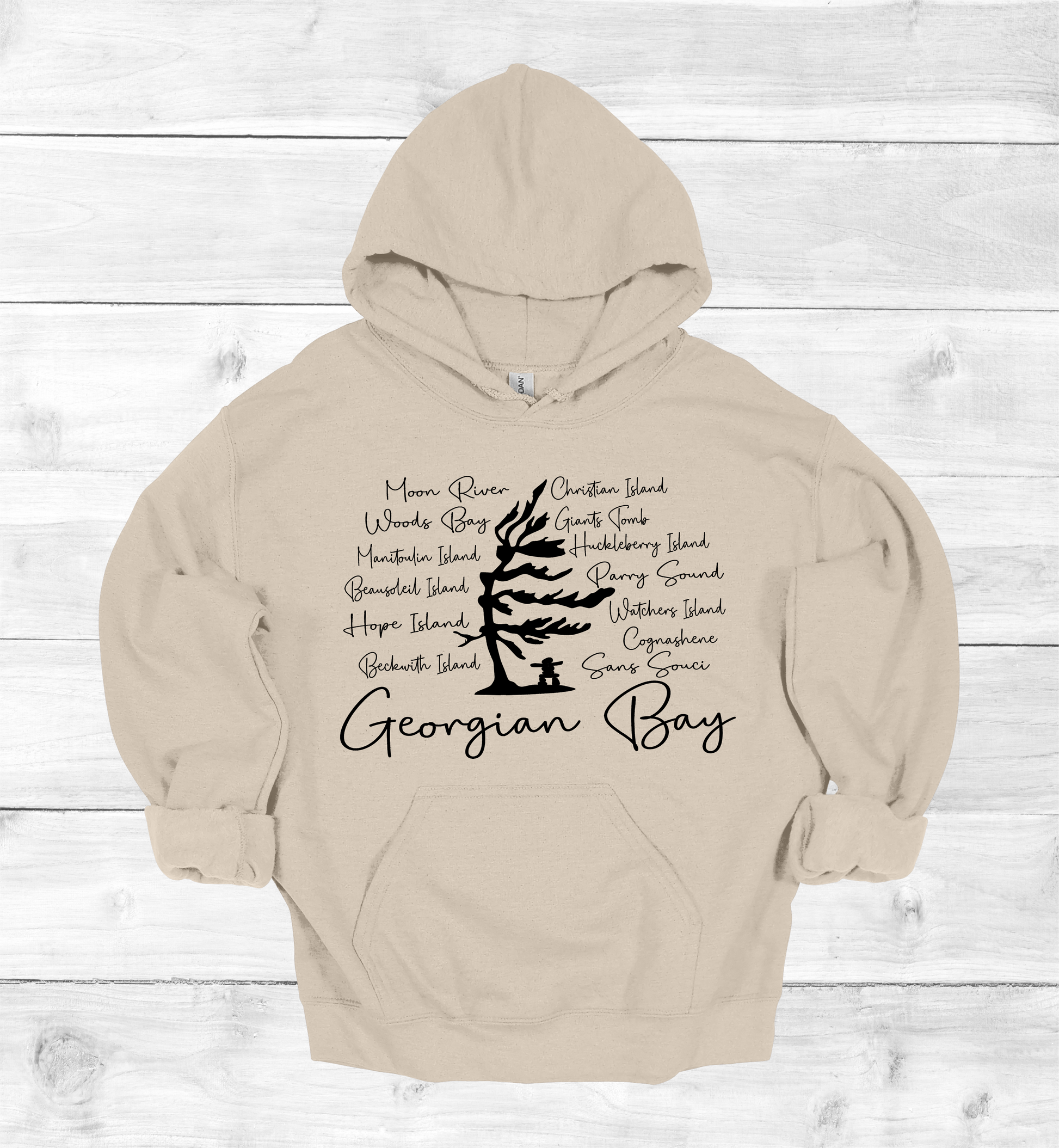 Stay warm and stylish with our Georgian Bay with Island names Hoodie, perfect for cool days out on the Bay or cozy campfire nights. Made for the ultimate Georgian bay lover, it also makes a great gift. Expertly crafted with the names of the iconic islands, this hoodie is a must-have for any Bay enthusiast.