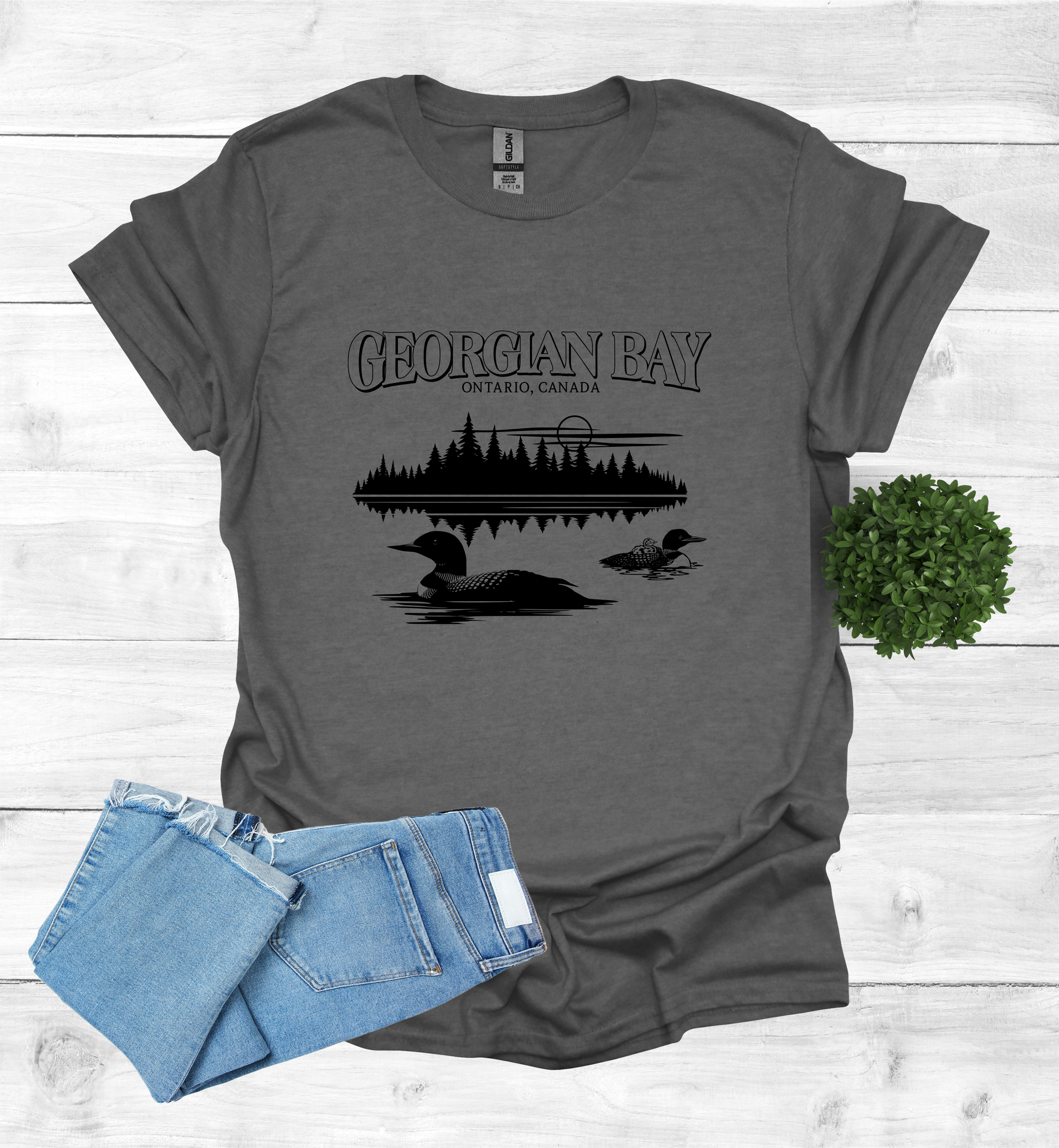 Designs are printed and applied to the shirt by us right here in Georgian Bay.