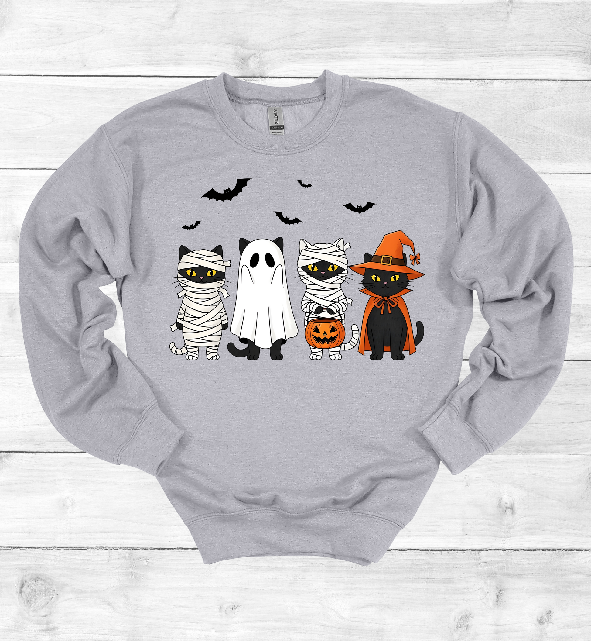 Embrace the playful spirit of Halloween with the Halloween Cats Sweater, showcasing adorable cats dressed in a mommy and ghost costume surrounded by fluttering bats. This Sweatshirt blends festive fun with cozy comfort, making it perfect for celebrating trick-or-treat night or gifting to cat lovers and holiday enthusiasts alike. Crafted to keep you warm during crisp autumn evenings, its unique design captures the whimsy and charm of Halloween, adding a touch of spooky delight to your seasonal wardrobe. Ideal for creating memorable moments with family and friends, this sweater is a must-have for the Halloween season.